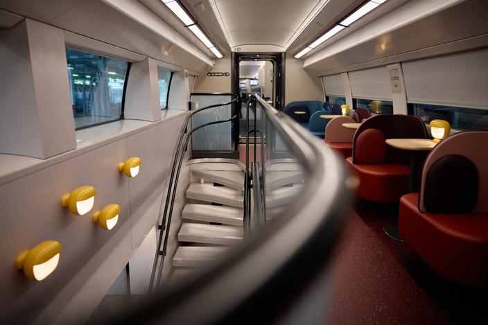 Le train pourra avoir 7, 8 ou 9 voitures, selon les besoins. L’intérieur est conçu pour être reconfiguré facilement (espaces bagages, sièges, restauration).