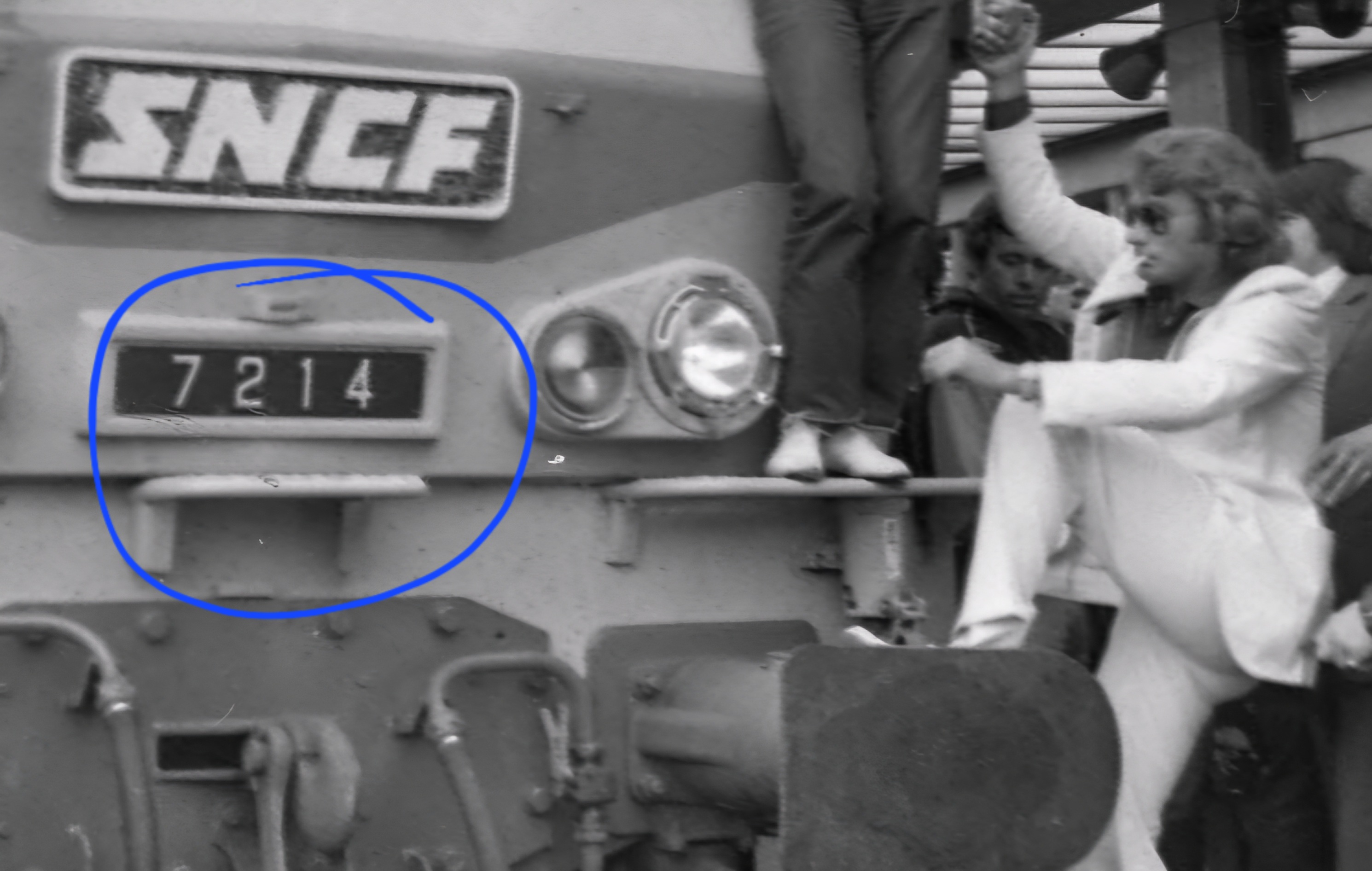Avant de partir au clos de Vougeot où devait se terminer la soirée, Johnny Hallyday, Jane Birkin et Serge Gainsbourg se sont livrés à quelques facéties sur la locomotive électrique du convoi.