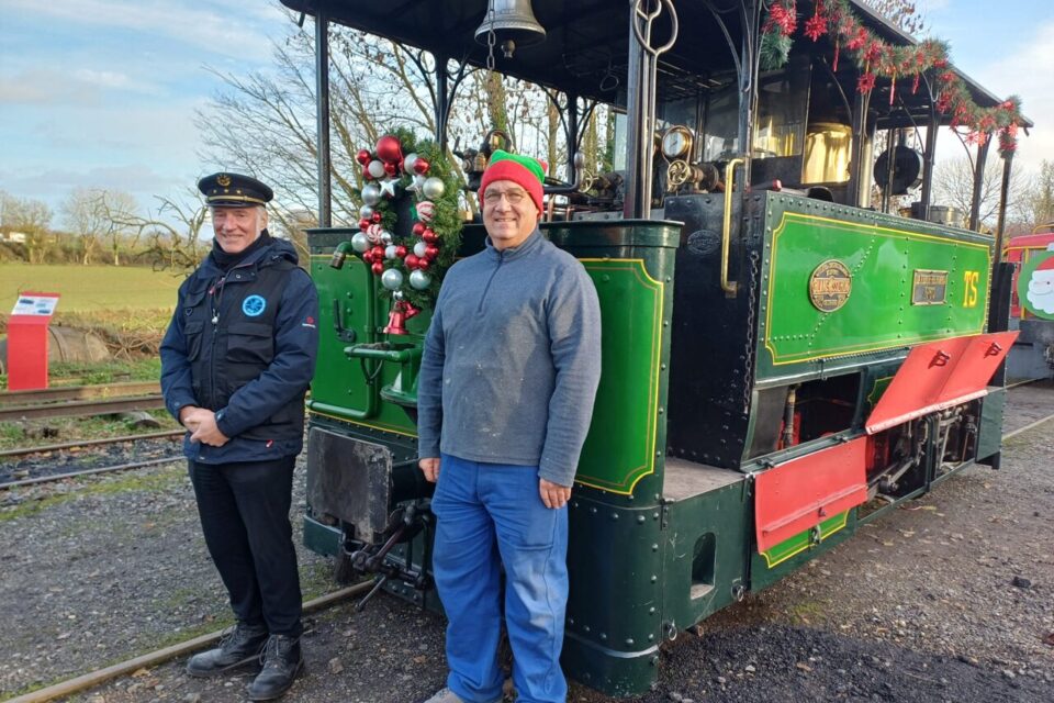 Alain, bénévole, et Olivier Jeanneau, président de l’association du MTVS, posent avec l’une de leurs locomotive, celle-ci à l’arrêt, mais tout de même décorée. (©Adrien Deschepper / actu Oise)