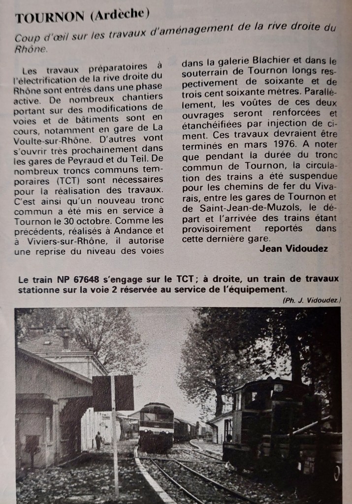 Ces travaux devraient êtrebterminés en mars 1976. A noter que pendant la durée du tronc commun de Tournon, la circulation des trains a été suspendue pour les chemins de fer du Vivarais, entre les gares de Tournon et de Saint-Jean-de-Muzols, le départ et l’arrivée des trains étant provisoirement reportés dans cette dernière gare.