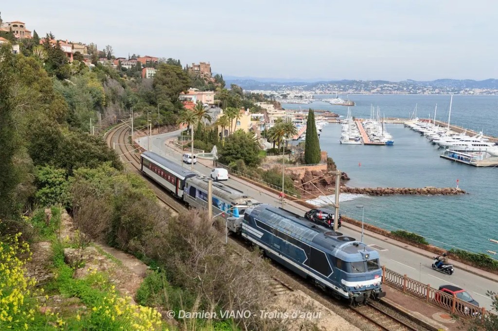 Sur ce cliché, alors que le soleil tente difficilement de percer ces entrées maritimes non prévues, le convoi traverse la gare de Théoule-sur-Mer, quelques minutes à peine après son départ, laissant derrière lui le port de la Rague et le château d’Agecroft.