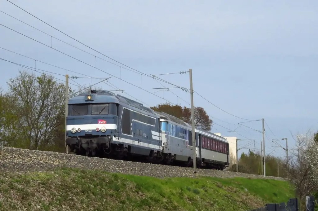 Après avoir été acheminée la nuit passée par convoi exceptionnel par le bord de mer jusqu’à la gare de Cannes-Marchandises où elle a été remise sur rails, la voici reprise par les BB 67522 et 67542 lors de sa première étape à destination d’Avignon Fontcouverte.