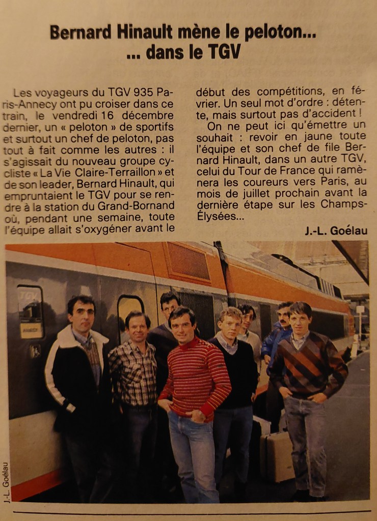 Les voyageurs du TGV 935 Paris-Annecy ont pu croiser dans ce train, le vendredi 16 décembre dernier, un peloton de sportifs et surtout un chef de peloton, pas tout à fait comme les autres : il s’agissait du nouveau groupe cycliste (La Vie Claire-Terraillon) et de son leader, Bernard Hinault, qui empruntaient le TGV pour se rendre à la station du Grand-Bornandoù, pendant une semaine, toute l’équipe allait s’oxygéner avant le début des compétitions, en février.